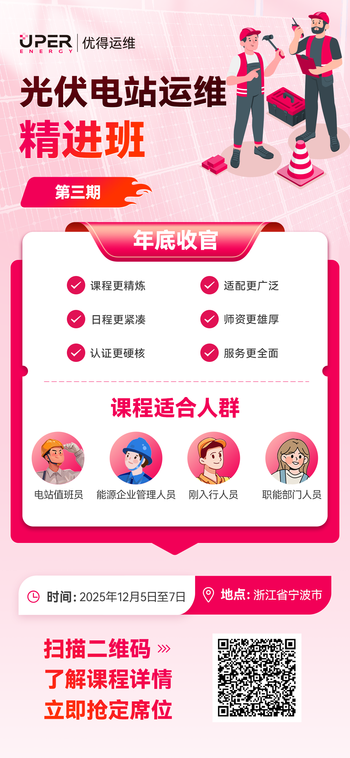 作为新能源运维领域的领军企业,优得运维依托国内外丰富实践经验,推出“光伏电站运维精进班”,精准对接行业人才需求。第三期课程现已启动报名。