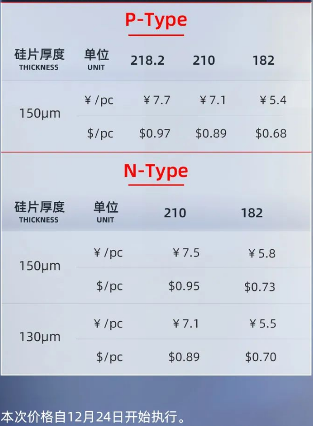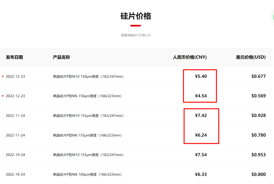 隆基绿能12月23日发布12月单晶硅片价格公示,“单晶硅片P型M6 150um厚度(166/223mm)”价格报4.54元人民币,“单晶硅片P型M10 150um厚度(182/247mm)”价格报5.40元人民币。