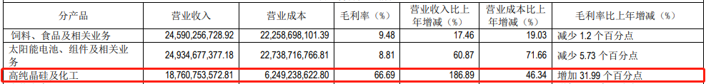 2021年,通威股份多晶硅产量10.93万吨,位居全球第一,中国市场占有量为22%。其硅料业务营收187.61亿元,毛利率达66.69%,成利润增长主体,远超其他业务。