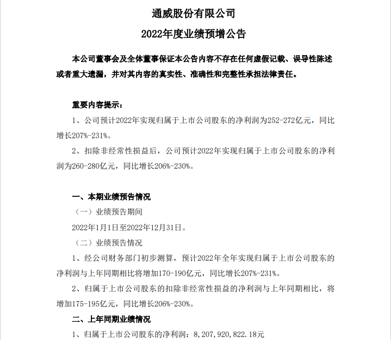 2023年1月19日晚间,通威发布2022年度业绩预增公告,预计2022年实现归属于上市公司股东的净利润为252-272亿元,较上年同期将增加170-190亿元,同比增长207%-231%。