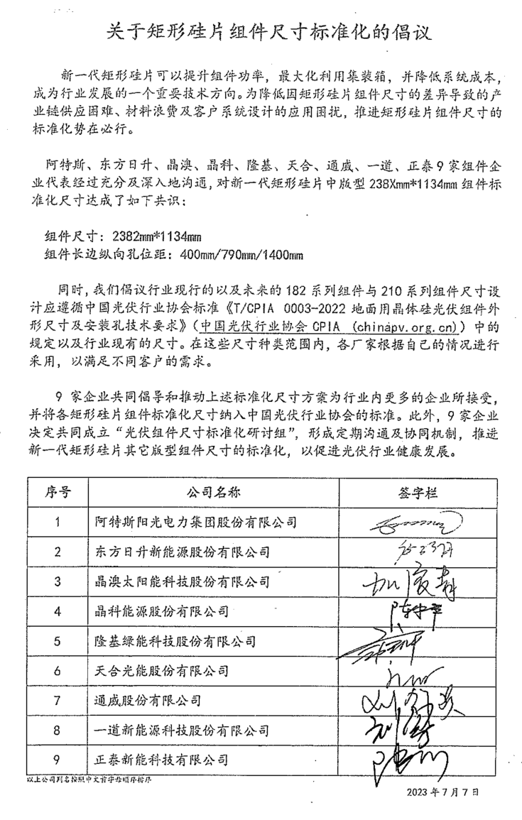 2023年7月,阿特斯、东方日升、晶澳、晶科、隆基、天合、通威、一道、正泰新能9家组件企业对新一代矩形硅片中版型组件尺寸达成了如下共识:
