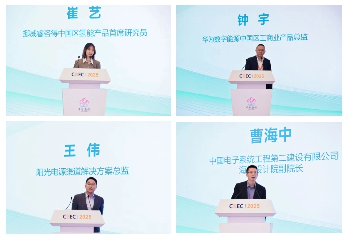 挪威睿咨得中国区氢能产品首席研究员崔艺、华为数字能源中国区工商业产品总监钟宇、阳光电源渠道解决方案总监王伟、中国电子系统工程第二建设有限公司海外设计院副院长曹海中、TüV南德意志集团光伏电站项目首席项目官王洋、极电光能有限公司联合创始人、总裁于振瑞,上海路明星光智能科技有限公司电力量化与交易算法资深专家王天荣分别就全球绿氢产业的产能与应用场景、“源网荷储”模式如何助力园区低碳转型、光储融合技术的应用案例、海外新能源工厂的建造与节能策略、光伏清扫机器人的实证数据、钙钛矿光伏产业化的现状与未来以及人工智能在电力市场化改革中的应用等议题进行深入解读。